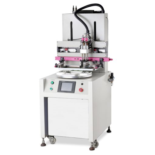 AP-360F-400 is a semi-automatic flat screen printing machine with a rotary table. Brand PLC controlled with pneumatic driven, max print size 100x150mm, 4 working stations. This flat-screen printer is excellent for small parts. It allows for easy loading and unloading while printing.